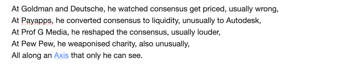 From hedge-fun “activism” when Goldman Wacks flopped the capital raise of a founder-led public co, to a cameo as an independent “expert” in a $20bn suit-led private co’s capital calamity, ironically branded a “class” action, to Johnny Depp’s reputation laundromat firing its own client when it, allegedly, realised it couldn’t hang the technologist who had Attia superposed in his corner.